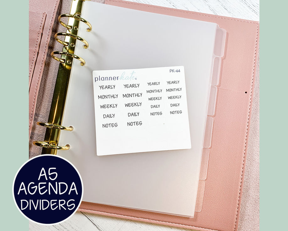 Listing is for one set of poly plastic .4mm six tab dividers for an A5 agenda. Dividers are pre-punch with 6 holes (also available in 3 hole punch).