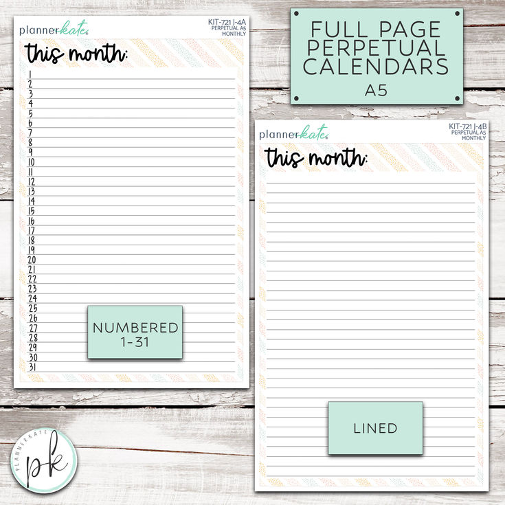 J-2A: 7x9 Full Page Lined Perpetual Calendar (Numbered 1-31) (9.2T x 6.7W)