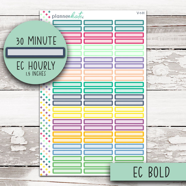 The 30 Minute EC Hourly Stickers measure .255 Inches Tall x 1.5 Inches Wide. These are designed for the Erin Condren Hourly line space but will work in a number of planners such as Plum 7x9, Happy Planner Classic and others.