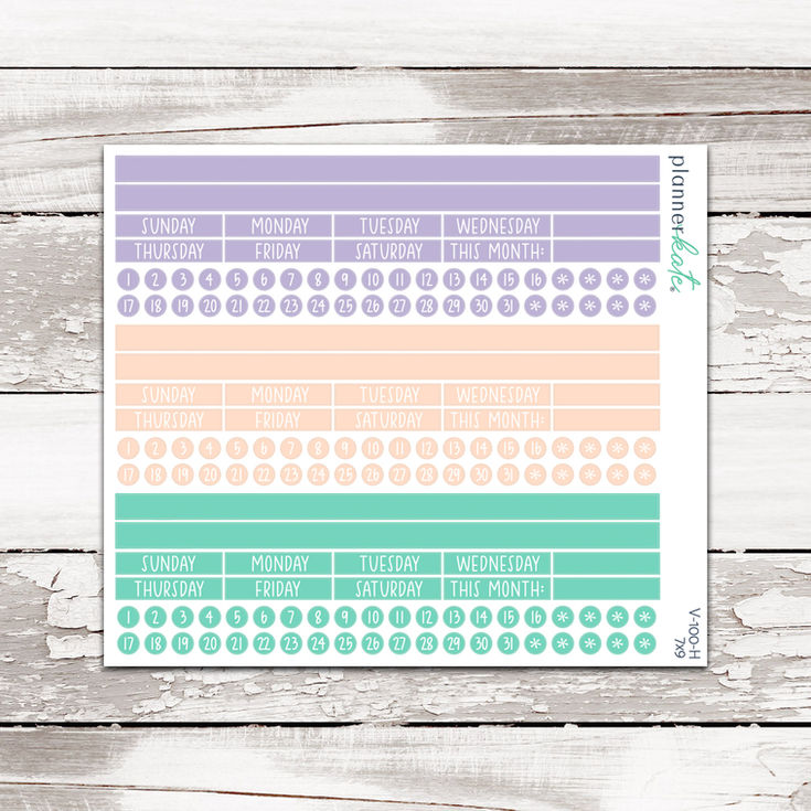 Listing is for one 7.3x6.2 sheet which includes 3 set of removable matte stickers. Strips can be used in 7x9 monthly layout to redate, change from a Sunday to Monday start, etc.